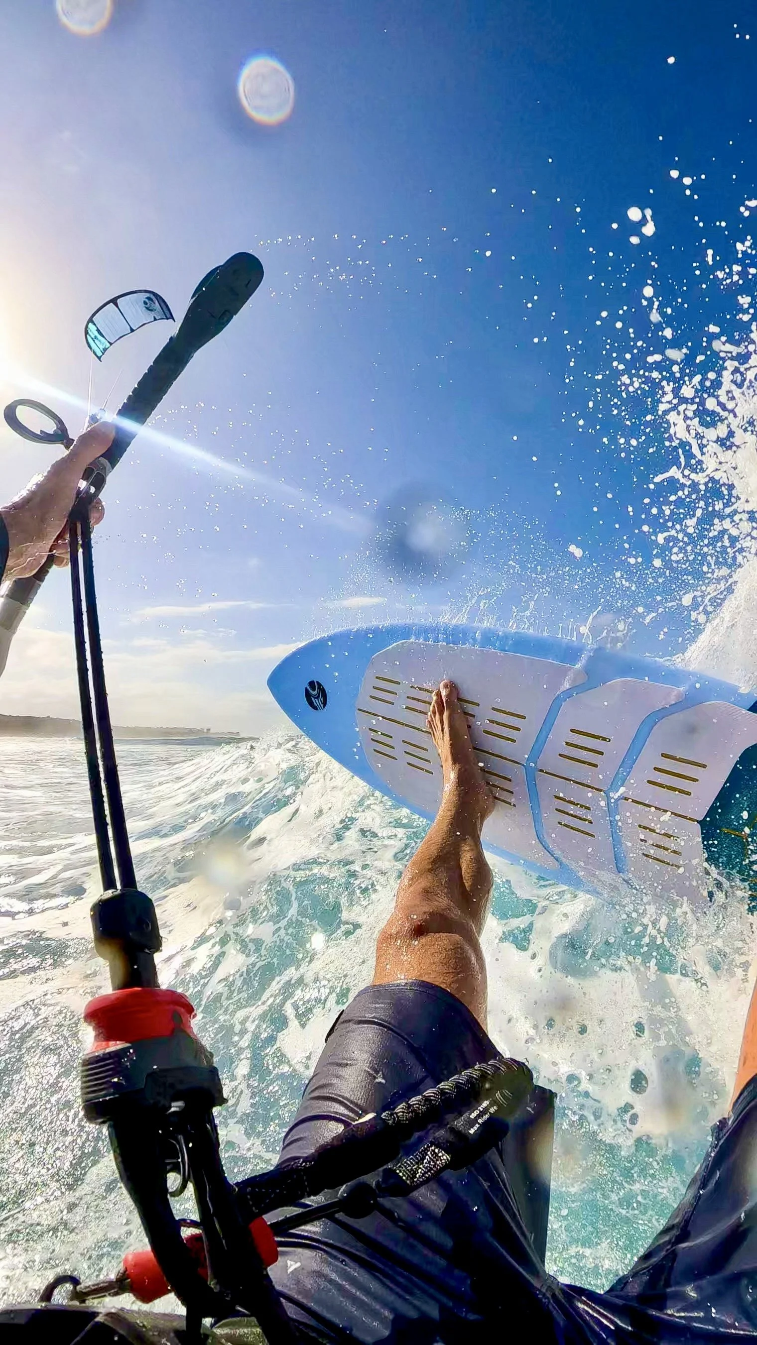 I’ve been riding Cabrinha kite surfboards since January 2023 and the Phantom and Flare (top right) are my favorite models. The 5’6” Phantom is my go-to travel board and I’ll use it regularly in Chile and Puerto Rico, both of which feature steep and powerful point breaks. The narrow profile and thin rails allow the Phantom to handle the higher speeds of kitesurfing, and generous rocker results in excellent top-to-bottom turn performance. I ride the Phantom with Cabrinha’s quad fin setup for most sessions, and thruster (3-fin) in the larger surf. The quad fins usually give me as much hold and control as I need, while still being able to blow out the tail easily on top turns. If the wave height is well beyond overhead, or the surface is a little bumpy, I’ll ride a thruster/3-fin setup for more control.